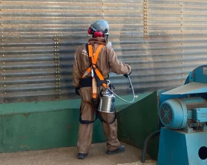 Remoção de resíduos incrustados e limpeza técnica profunda para evitar a proliferação de fungos e pragas em estoques de grãos.